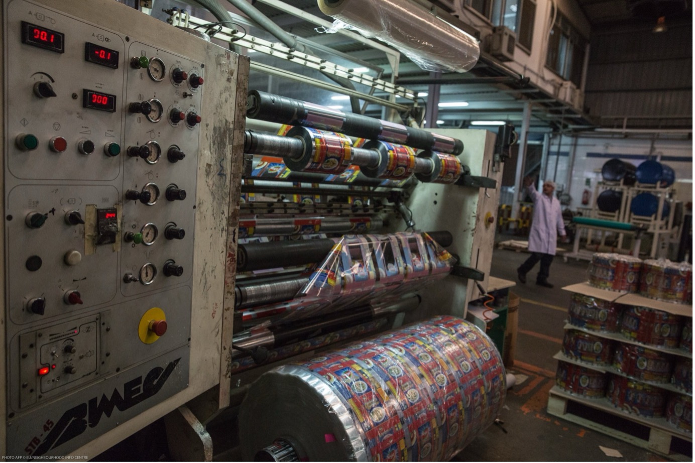Title: The printing line of a factory with an integrated Solvent Recovery Plant to capture emissions at the source.