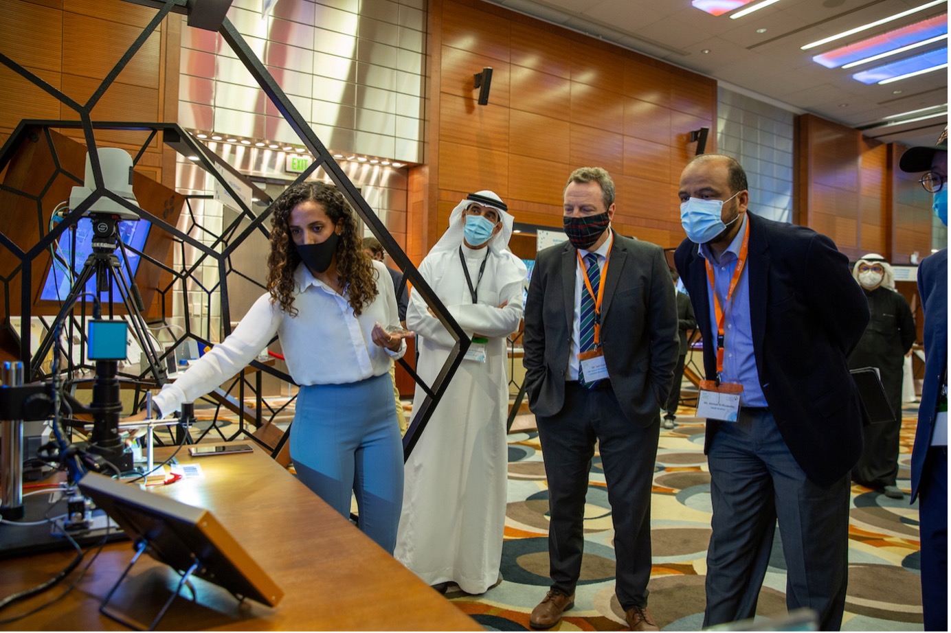 Title: A KAUST researcher demonstrates a solar-powered hydrogen production system, developed in Professor Thomas Anthopoulos's group, to key stakeholders from government and industry.