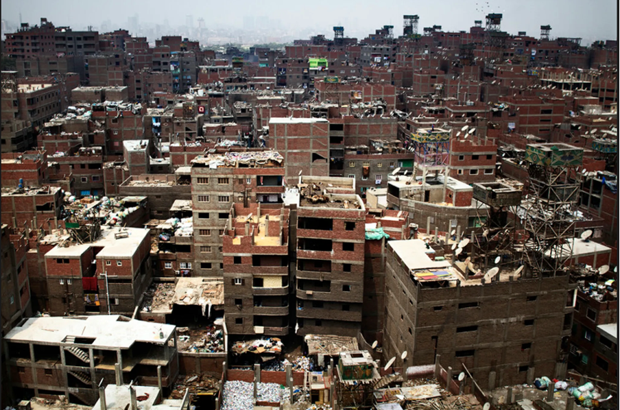 Title: Aerial view of the Manshiyat Naser community (Zabaleen), illustrating the high-density urban fabric and limited essential services.