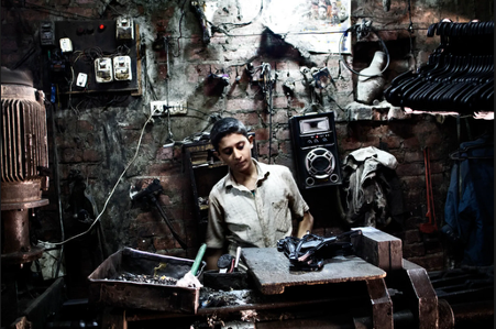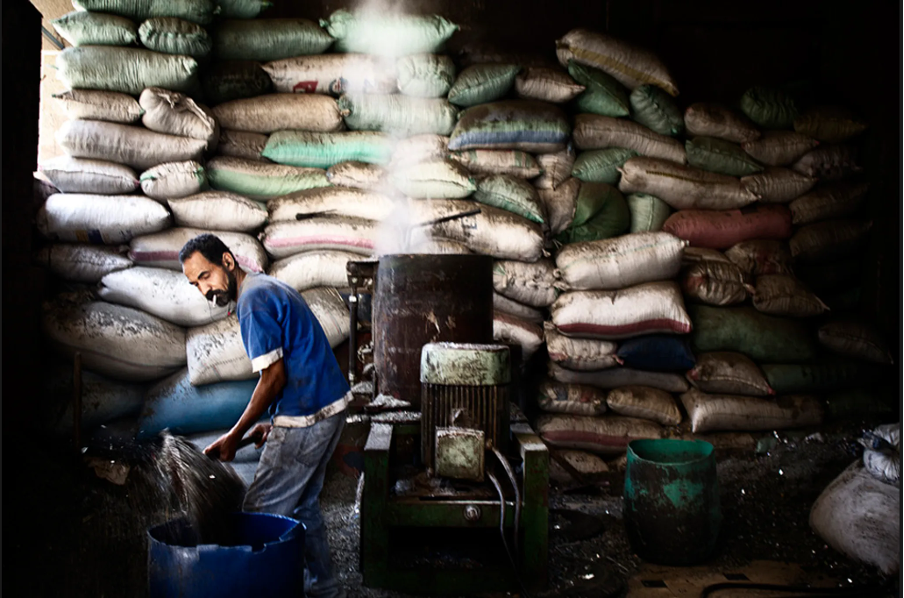 Title: Workers engaged in simple recycling process within one of the small-scale, informal recycling workshops in Manshiyat Naser.